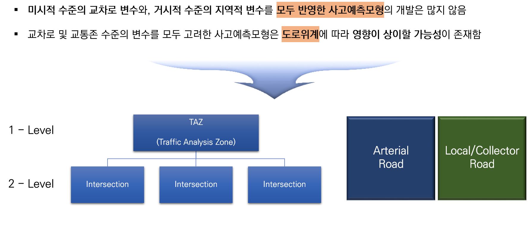 교차로 교통사고 분석의 접근 방법은 크게 두 가지로 구분된다. 교차로의 미시적 변수(기하구조, 신호, 제한속도 등)를 고려해 교통사고의 직접적인 원인을 분석하거나, 지역적 수준을 고려한 거시적 변수(인구, 토지이용, 통행 특성 등)를 고려해 교통안전시설 계획의 관점에서 장기적 예방 대책을 도출할 수 있다. 교차로 및 지역적 수준의 변수를 모두 고려한 모형은 높은 모형적합도와 종합적인 시사점을 얻을 수 있음에도 연구가 많지 않았고, 일부 연구에서는 방법론적인 한계를 보여주었다. 한편, 교차로 교통사고 위험요인은 도로 위계에 따라 그 영향이 다를 수 있음에도 이를 고려한 연구가 부족했다. 따라서 본 연구에서는 위계적 음이항 모형을 통해 교차로 변수와 지역적 변수를 동시에 고려한 모형을 구축하고, 도로 위계에 따라 교통안전에 영향을 미치는 위험요인을 제시하였다. 본 연구에서는 분산분할계수(Variance Partition Coefficient, VPC)를 산정하여 간선도로와 집산 및 국지도로 교차로 사고분석 시 상위 지역적 영향이 크며, 그에 따라 위계적 모형 적용이 타당함을 보였다. 또한, 상위 지역적 영향은 간선도로 내 교차로보다 집산 및 국지도로에서 더 크다는 것을 확인하였다. 분석 결과, 교차로 사고 건수는 지역적 인구밀도 및 토지이용(상업지역, 공업지역, 비건축지역)에 따라 달라짐을 확인하였다.